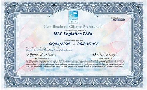 Certificate of good record and management of your account within the DCS program by the shipping companies, Crowley, Great White Fleet, King Ocean, Seaboard Marine.